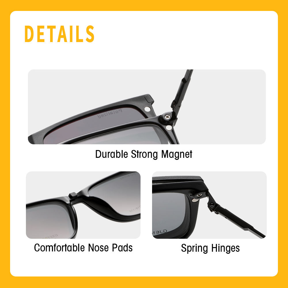 Easy to wear, the clips with magnets allow you to switch between different lenses at will, and have 4 different styles of sunglasses at the same time.One is polarized lens; One is night driving polarized lens; Two are non-polarized sunglasses lenses.