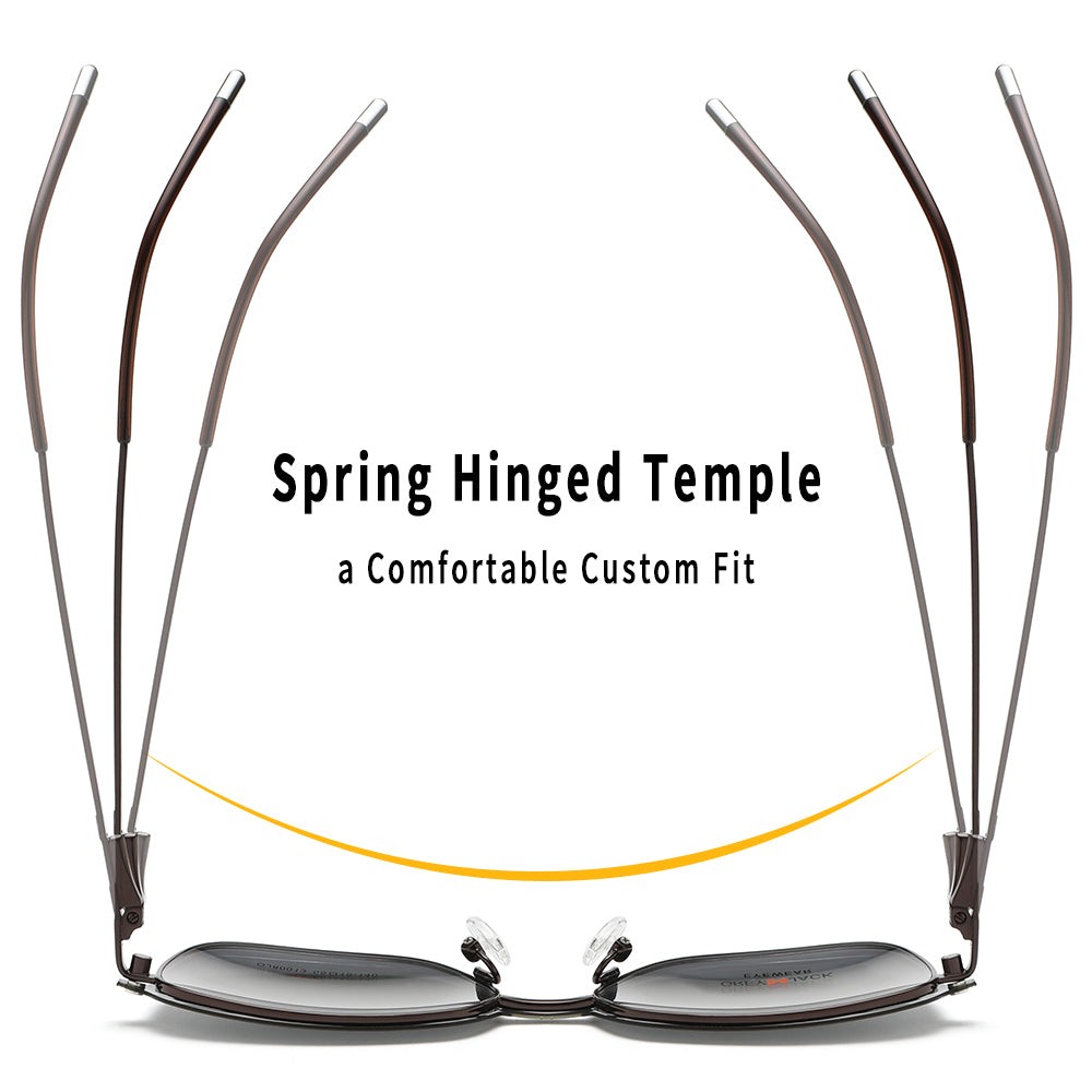 Flexible Spring hinges in the frame that add to the ease of getting them on and off and enhance the fit. Takes pressure off your ears and helps prevent bending the frames!
