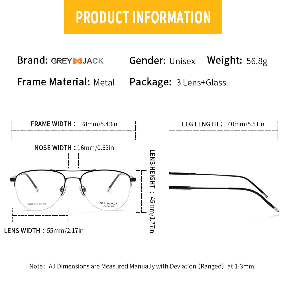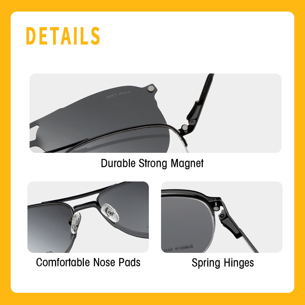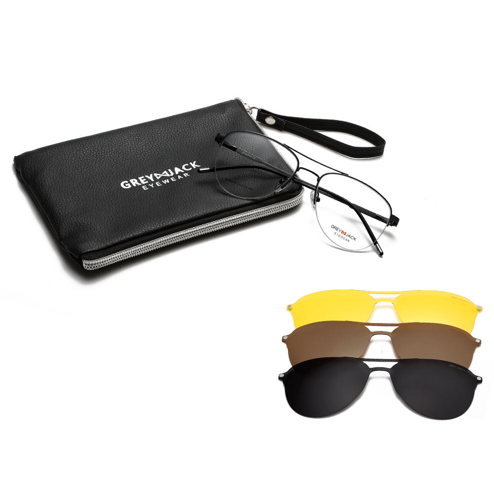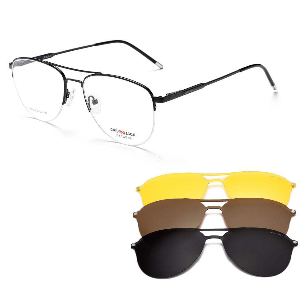 GREY JACK 3pcs Clip On Sunglasses Metal Pilot Spectacle Frame with Magnet Lens 80018