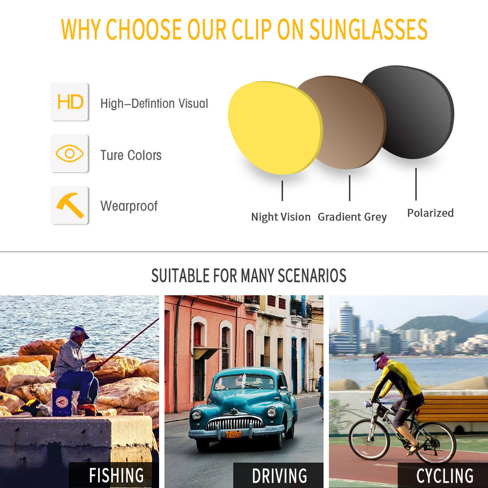 Easy to wear, the clips with magnets allow you to switch between different lenses at will, and have 3 different styles of sunglasses at the same time.One is polarized lens; One is night driving lens; One is brown sunglasses lens.