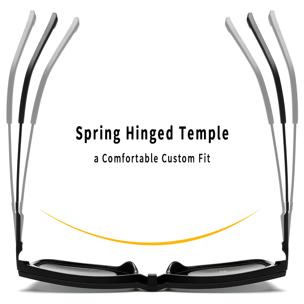 Flexible Spring hinges in the frame that add to the ease of getting them on and off and enhance the fit. Takes pressure off your ears and helps prevent bending the frames!