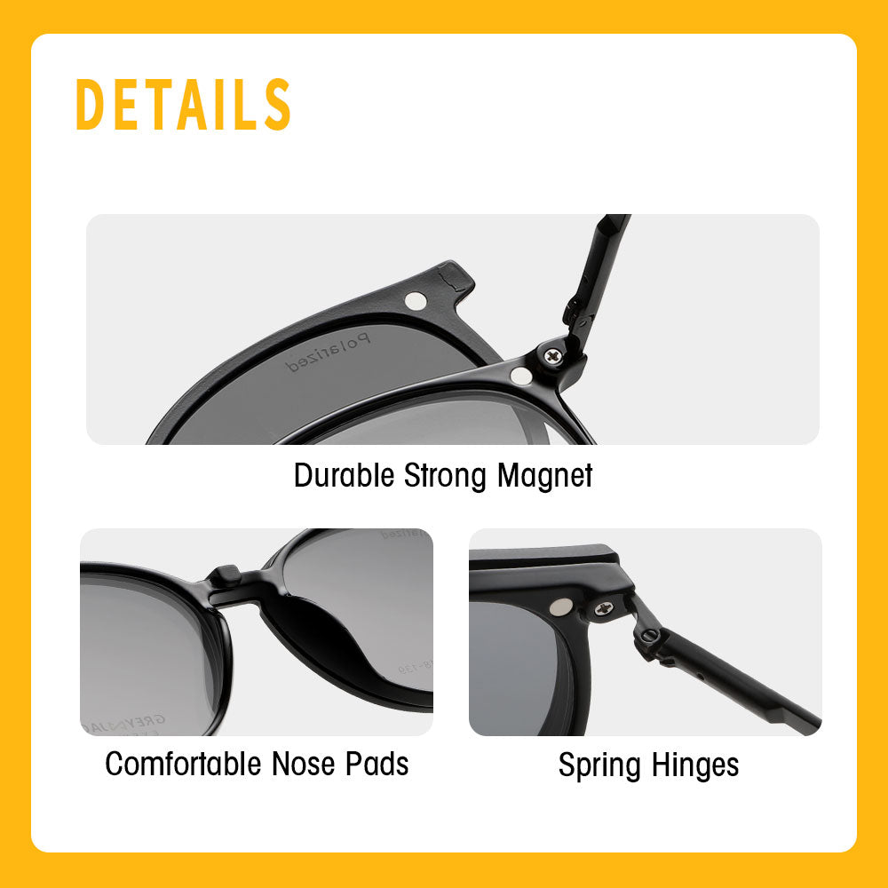Easy to wear, the clips with magnets allow you to switch between different lenses at will, and have 4 different styles of sunglasses at the same time. One is polarized lens; One is night driving polarized lens; Two are non-polarized sunglasses lenses.