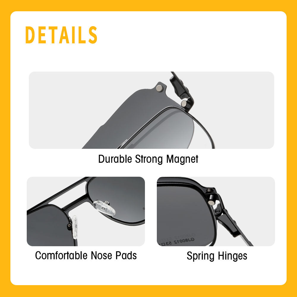 The easy magnetic clip sunglasses is very convenient to wear. The right and left magnets of the lens will be together with the hanging adsorption frame automatically when approaching.It have 3 pcs magnetic sunglasses lenses.one are polarized lens,one is for night driving lens,one is sunglasses lens.