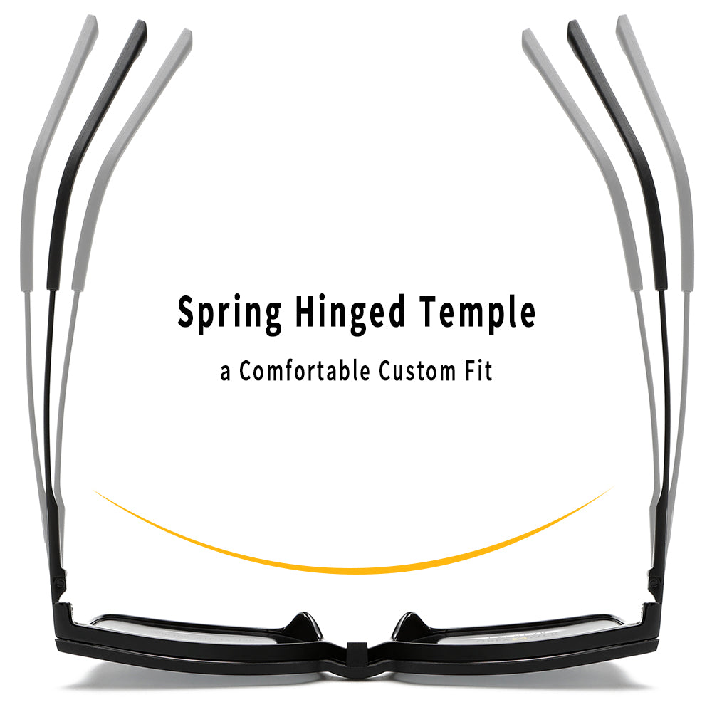 Flexible Spring hinges in the frame that add to the ease of getting them on and off and enhance the fit. Takes pressure off your ears and helps prevent bending the frames!