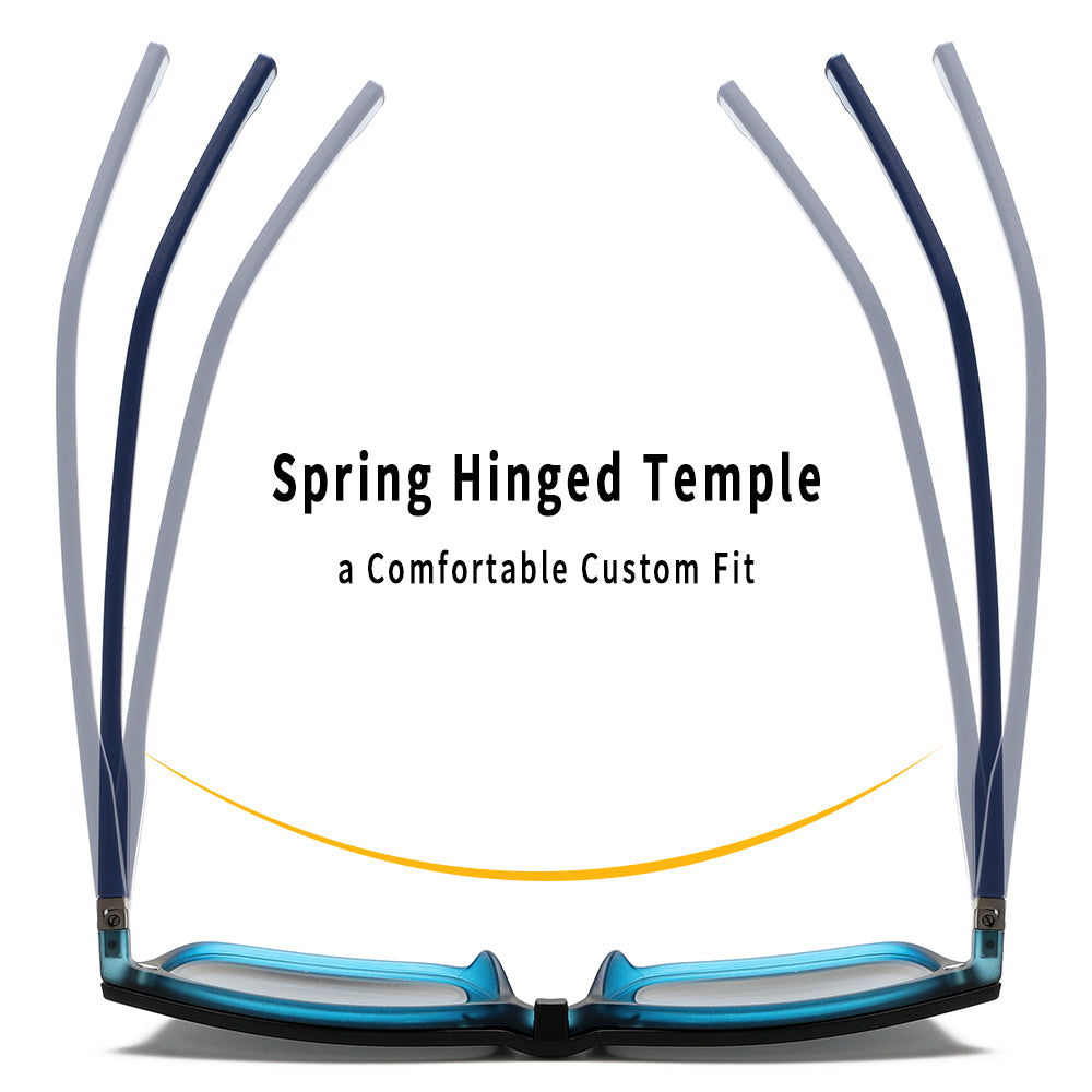 Flexible Spring hinges in the frame that add to the ease of getting them on and off and enhance the fit. Takes pressure off your ears and helps prevent bending the frames!It is suitable for all face shapes.