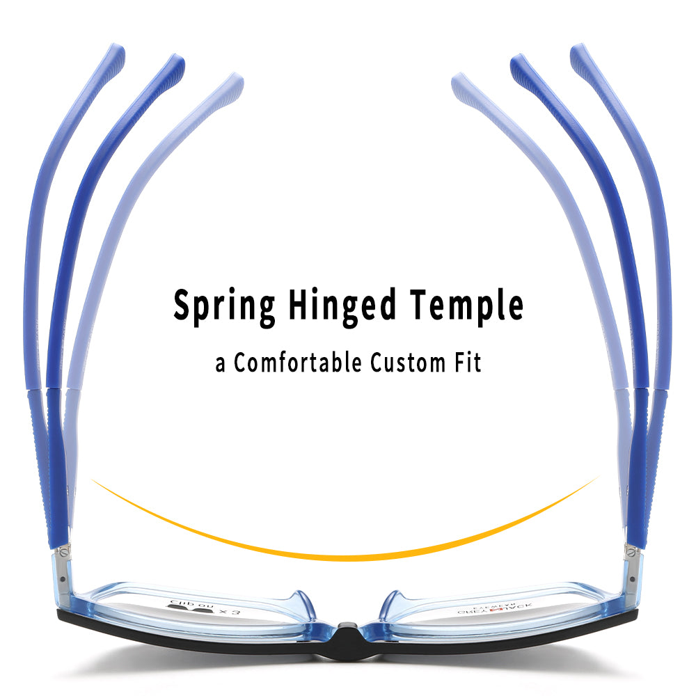 Flexible Spring hinges in the frame that add to the ease of getting them on and off and enhance the fit. Takes pressure off your ears and helps prevent bending the frames!