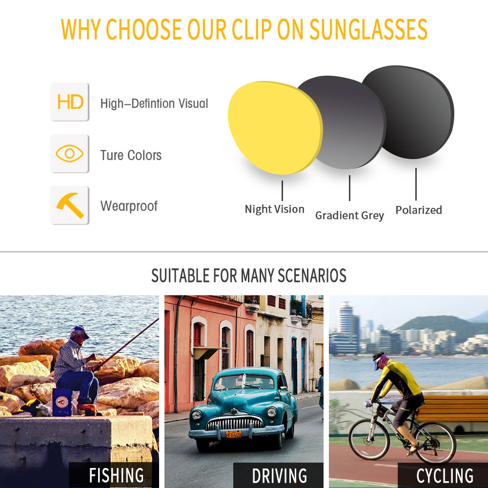 The easy magnetic clip sunglasses is very convenient to wear. It designed for myopic men women.The right and left magnets of the lens will be together with the hanging adsorption frame automatically when approaching.